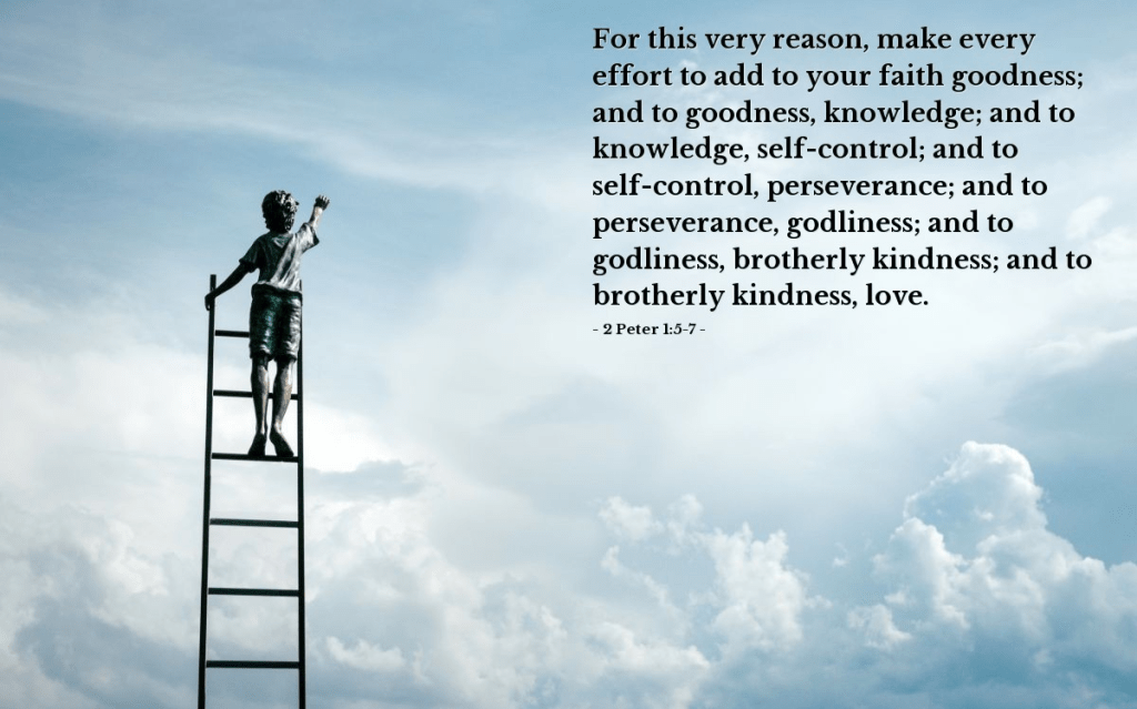 But also for this very reason, giving all diligence, add to your faith virtue, to virtue knowledge, to knowledge self-control, to self-control perseverance, to perseverance godliness, to godliness brotherly kindness, and to brotherly kindness love.