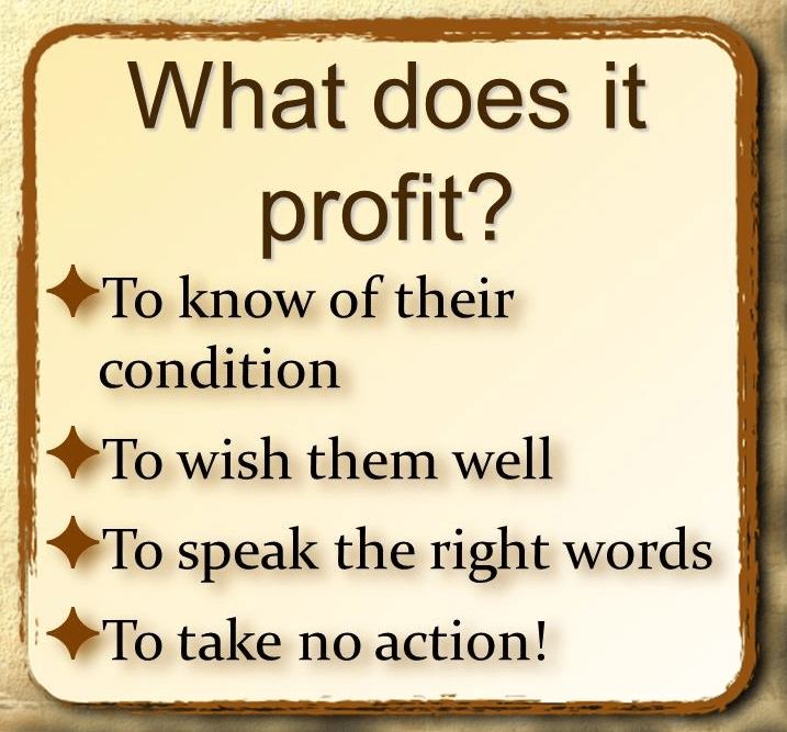 What does it profit, my brethren, if someone says he has faith but does not have works? Can faith save him? If a brother or sister is naked and destitute of daily food, and one of you says to them, “Depart in peace, be warmed and filled,” but you do not give them the things which are needed for the body, what does it profit?