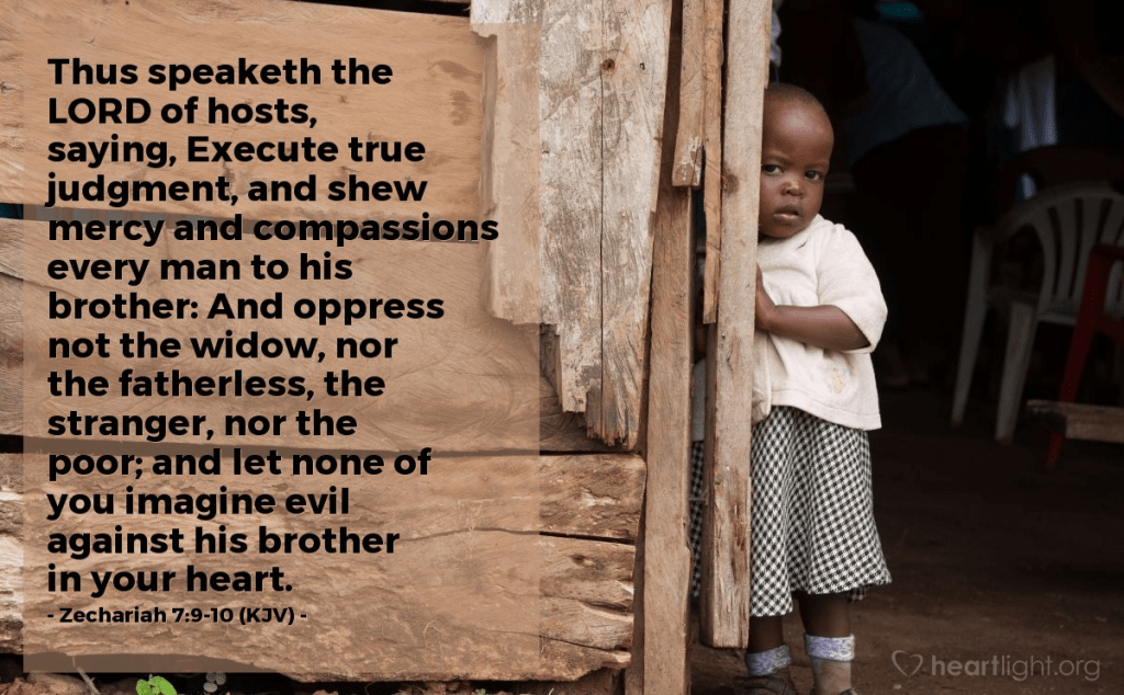 Thus says the Lord Almighty: ‘Render a just judgment; show mercy and compassion each to his brother. 10 Do not oppress the widow, or the orphan, or the foreigner, or the poor. And let not one remember in his heart any wrong of his brother.’